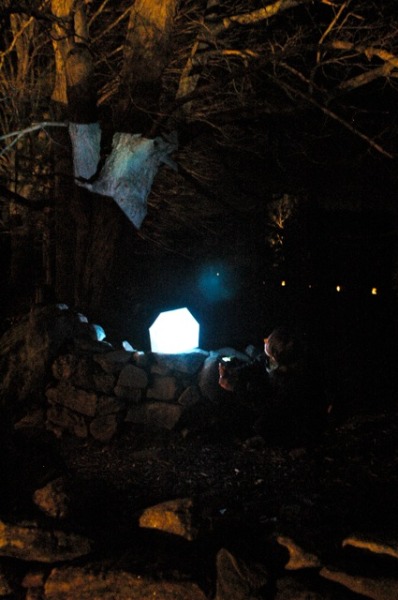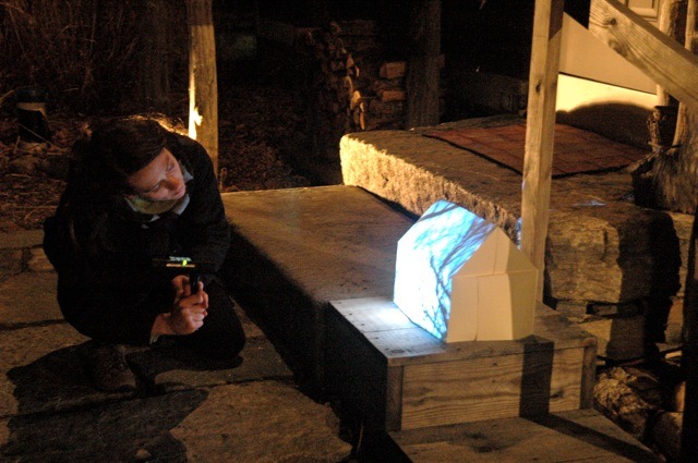 I-walk is an ephemeral site-specific visual-walk and an installation that reflect on the natural enclave of I-Park premises, and on the buildings constructed within the park (main house, library house, studio huts, tool sheds, barn, workshop studio). The artwork consists of an 8-minute silent video projected with a portable projector on different surfaces, building walls and on five origami houses that were installed along the path that connects the main house with the pond studio.