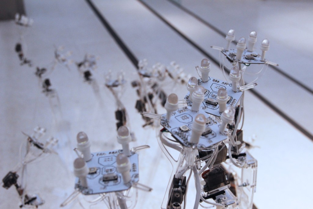 The Lichtsuchende are small static robotic creatures, forming an interactive digital photo-kinetic sculpture. Their movement is modelled after sunflowers turning to face then sun, in their constant search for effulgent nourishment. As well as consuming light, they can produce light, giving possibilities of exchange and communication, and an ascension up Maslow’s hierarchy of needs. They are presented in the form of an interactive installation – a group of around 25 Lichtsuchende are placed in an otherwise dark room; participants enter with torches and engage with the robots, setting up cascades of movement and light, and exchanging photonic information with the cyber-society