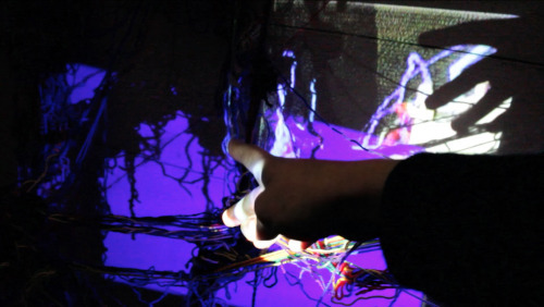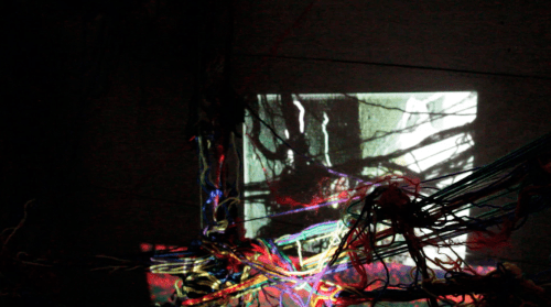 Walk-itch is a site-specific visual walk and wool installation inside a corridor. The work is composed of a number of portable projectors, radio frequency receivers and live-stream surveillance wireless cameras. All the equipment is powered through batteries.