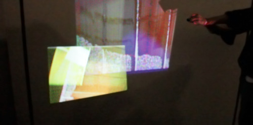Each portable set is composed of a portable projector, a receiver and a wireless camera which are handed over to participants. Participants operate the equipment in pairs, one person carries the portable projector (plugged into the receiver), and the other carries the wireless camera.