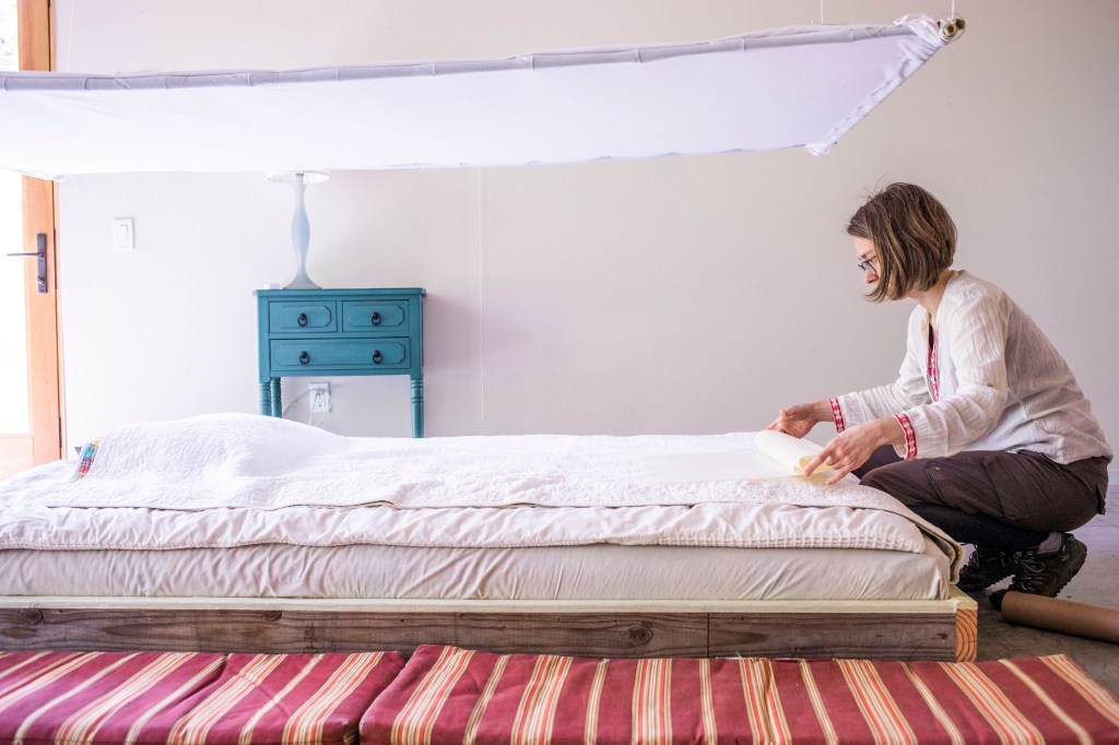 “zones of flow (iv)” is an interactive audiovisual installation that invites people to rest between two bodies of water: a waterbed and a back-lit projection screen, where moving images of water surfaces are projected. Lying down, the visitor is flowing and sandwiched between visual representations of water and a body of water itself – the waterbed – while also being surrounded by sounds, which add another dimension of immersion to the experience.