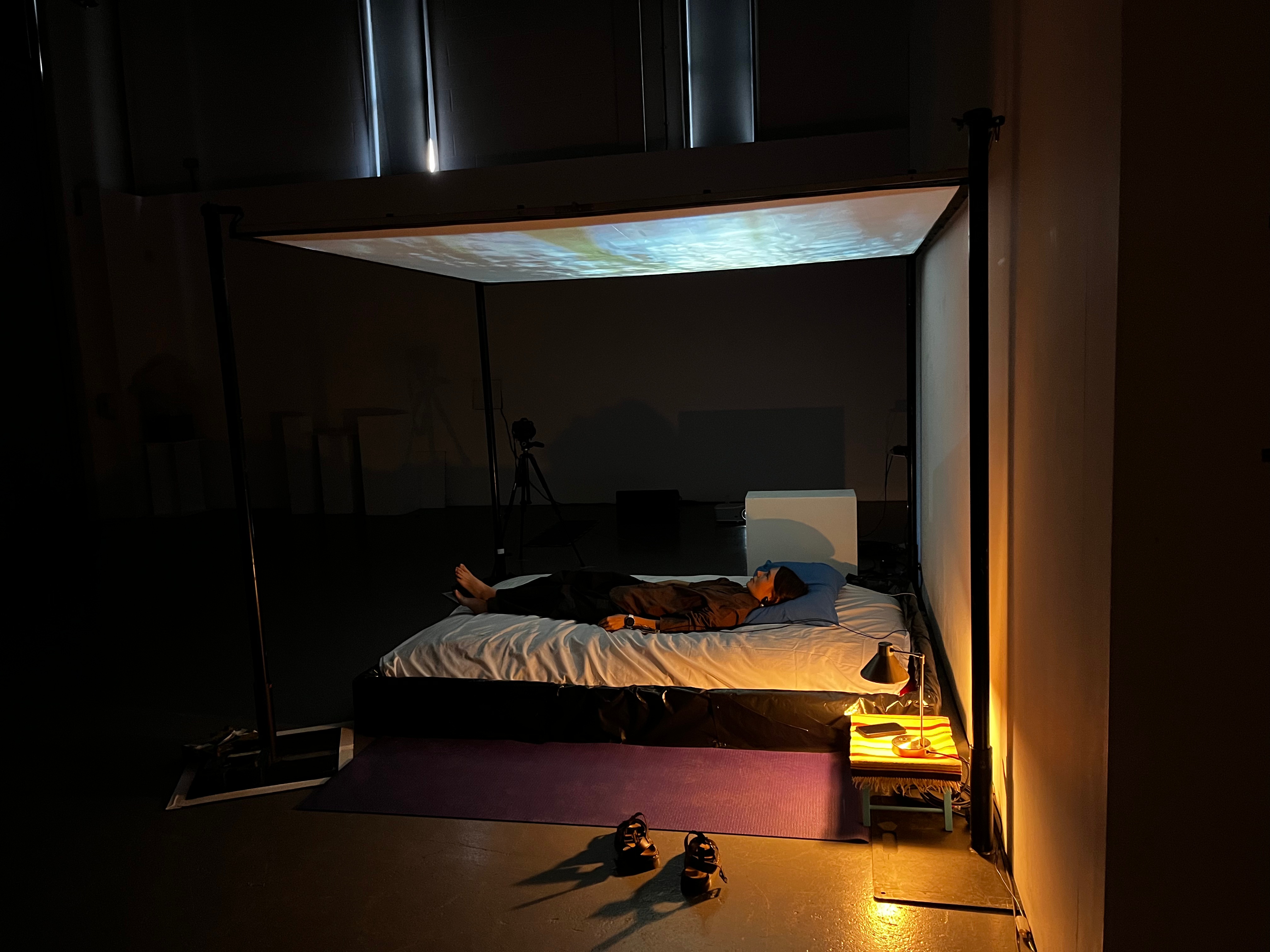 Interactive audiovisual installation involving a waterbed, horizontal projection screen, LeapMotion sensor, microcontroller and pressure sensor, and running via TouchDesigner and Arduino.